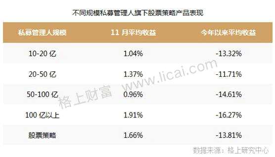 另據(jù)格上研究中心統(tǒng)計數(shù)據(jù)顯示,11月股票策略私募基金平均收益率為1.66%。火山君還發(fā)現(xiàn),大私募機構(gòu)在11月的平均表現(xiàn)優(yōu)于中小私募機構(gòu),從規(guī)模角度來看,10億元規(guī)模以上的私募11月平均收益均為正,其中100億元以上規(guī)模私募盈利幅度大于行業(yè)平均。不過從前11個月數(shù)據(jù)來看,前11個月百億級私募平均業(yè)績不敵中小私募,今年以來中小私募表現(xiàn)相對較好,百億級規(guī)模私募平均收益率排名靠后。
