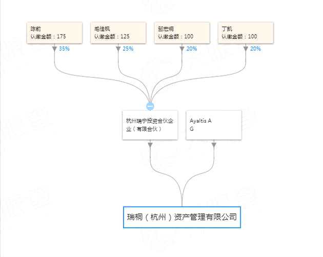 據(jù)天眼查數(shù)據(jù)顯示,瑞桐(杭州)資產(chǎn)管理有限公司的股東由杭州瑞寧投資合伙企業(yè)(有限合伙)和Ayaltis AG構(gòu)成。天眼查數(shù)據(jù)還顯示,杭州瑞寧在2018年10月17日進(jìn)行了變更,在之前的陳前(執(zhí)行事務(wù)合伙人)和毛佳楓的基礎(chǔ)上新增了鄒宏炯和丁凱兩位股東,陳前持股35%、毛佳楓持股25%、鄒宏炯持股20%、丁凱持股20%。