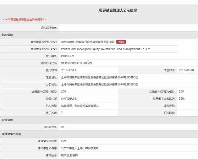 外資備案私募機(jī)構(gòu)的步伐越來越快。12月13日,珀金埃爾默(上海)股權(quán)投資基金管理有限公司在基金業(yè)協(xié)會(huì)登記備案,該私募在8月28日成立,注冊(cè)地址為上海市浦東新區(qū)自由貿(mào)易試驗(yàn)區(qū)張衡路1670號(hào)第5層D區(qū),注冊(cè)資本200萬美元,實(shí)繳資本100萬美元,企業(yè)性質(zhì)為外商獨(dú)資企業(yè),法定代表人張晟。