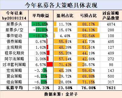 值得注意的是,今年跌幅最大的是事件驅(qū)動(dòng)策略,金斧子數(shù)據(jù)顯示,截至12月中旬,納入統(tǒng)計(jì)的108只事件驅(qū)動(dòng)私募產(chǎn)品,其平均虧損高達(dá)18.47%,所有產(chǎn)品中虧損的占比92.54%。