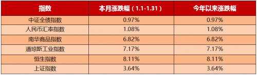 香港市場方面恒生指數(shù)截止到1月31號上漲8.11%。美國市場方面截止到1月31號道瓊斯指數(shù)工業(yè)指數(shù)上漲8.66%,納斯達(dá)克100指數(shù)上漲9.11%,1月美國三大股指普遍上漲。
