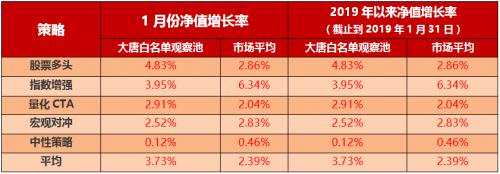 根據(jù)大唐財(cái)富金融市場部數(shù)據(jù)顯示,1月份進(jìn)入大唐財(cái)富白名單觀察池**64家,覆蓋五大策略:股票多頭/指數(shù)增強(qiáng)/中性策略/宏觀對沖/量化CTA。2019年以來私募行業(yè)平均收益為2.39%,大唐財(cái)富觀察池中私募平均收益為3.73%。