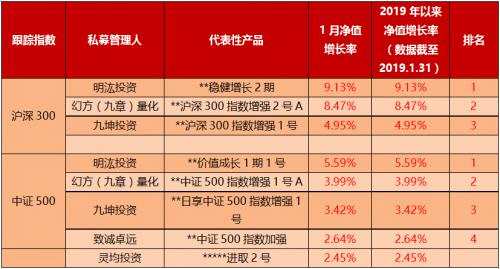 進(jìn)入大唐白名單觀察池中指數(shù)增強(qiáng)的私募管理人有九坤、銳天、幻方、致誠卓遠(yuǎn)、明汯和靈均。6家機(jī)構(gòu)旗下增強(qiáng)型產(chǎn)品1月份的平均增長率弱于頭部主觀選股機(jī)構(gòu)。明汯投資旗下滬深300指數(shù)增強(qiáng)型產(chǎn)品表現(xiàn)最好,2019年以來上漲9.13%;幻方(九章)量化產(chǎn)品今年表現(xiàn)也較亮眼。