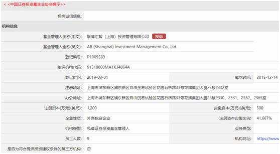協(xié)會信息顯示,聯(lián)博匯智成立于2015年12月14日,在今年3月1日完成私募基金管理人備案登記,成為第17家進(jìn)軍中國市場的外商獨(dú)資私募證券投資基金管理人。工商信息也顯示,聯(lián)博匯智由聯(lián)博香港有限公司(ALLIANCEBERNSTEIN HONG KONG LIMITED)全資控股,注冊資本為1200萬美元。