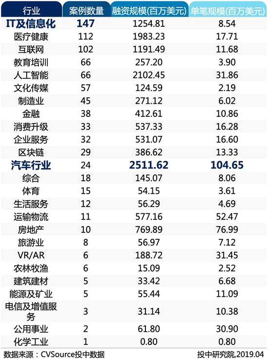 而從發(fā)生融資數(shù)量或獲得融資金融較多的細(xì)分領(lǐng)域來看,一季度投融資的焦點(diǎn)主要集中在IT及信息化和汽車行業(yè)。一方面,IT及信息化以147起融資案例位于各行業(yè)融資案例之首;汽車行業(yè)則以25.12億美元成為過去三個(gè)月獲得了最多融資的行業(yè)。此外,醫(yī)療健康、互聯(lián)網(wǎng)、教育培訓(xùn)、人工智能領(lǐng)域也是在一季度發(fā)生較多融資案例或獲得較大金額的賽道。
