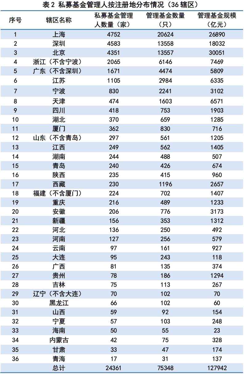 截至2019年3月底,已登記私募基金管理人數(shù)量從注冊地分布來看(按36個轄區(qū)),集中在上海、深圳、北京、浙江(除寧波)、廣東(除深圳),總計占比達71.52%,略低于2月份的71.65%。其中,上海4752家、深圳4583家、北京4351家、浙江(除寧波)2065家、廣東(除深圳)1671家,數(shù)量占比分別為19.51%、18.81%、17.86%、8.48%、6.86%。具體情況見下表: