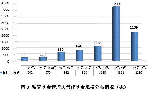 截至2019年3月底,已登記私募基金管理人管理基金規(guī)模在100億元及以上的有242家,管理基金規(guī)模在50億—100億元的279家,管理基金規(guī)模在20億—50億元的662家,管理基金規(guī)模在10億—20億元的828家,管理基金規(guī)模在5億—10億元的1130家,管理基金規(guī)模在1億—5億元的4311家,管理基金規(guī)模在0.5億—1億元的2269家。截至2019年3月底,已登記的私募基金管理人有管理規(guī)模的共21317家,平均管理基金規(guī)模6.00億元。
