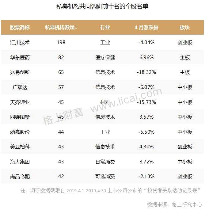 從個(gè)股來(lái)看,4月私募機(jī)構(gòu)共同調(diào)研的前5名個(gè)股分別為匯川技術(shù)、華東醫(yī)藥(000963)、兆易創(chuàng)新(603986)、廣聯(lián)達(dá)(002410)、天齊鋰業(yè)(002466)。受機(jī)構(gòu)關(guān)注度最高的前10家公司主要行業(yè)為信息技術(shù)和工業(yè)、材料等,所屬板塊也多居于中小創(chuàng)板塊。