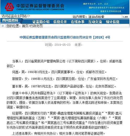 5月23日,四川證監(jiān)局發(fā)布一則公告,對當(dāng)事人四川省昊宸資產(chǎn)管理有限公司(簡稱“四川昊宸”)出現(xiàn)的產(chǎn)品合同向投資者書面承諾投資保本的違法行為,出具行政處罰決定書。