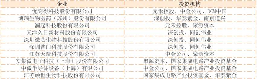 具體而言,一方面,主流創(chuàng)投機構(gòu)維持著穩(wěn)定的捕抓能力,如深創(chuàng)投、達晨創(chuàng)投、元禾控股等均出現(xiàn)在了多家企業(yè)的股東序列之中。另一方面,部分產(chǎn)業(yè)基金和地方中小基金也開始發(fā)力,投出了不少亮點。例如,國家集成電路產(chǎn)業(yè)投資基金就捕獲了中微半導(dǎo)體設(shè)備(上海)有限公司(以下簡稱中微半導(dǎo)體)、安集微電子科技(上海)股份有限公司(以下簡稱安集微電子)和上海硅產(chǎn)業(yè)集團股份有限公司,其中安集微電子已過會,中微半導(dǎo)體已上會。