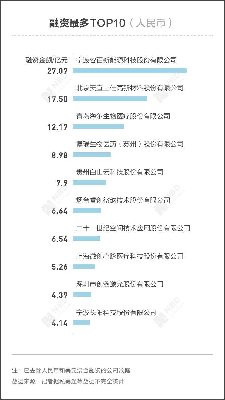據(jù)記者不完全統(tǒng)計(jì),在114家科創(chuàng)企業(yè)的融資中,人民幣融資金額排在前列的為寧波容百新能源科技股份有限公司(以下簡稱寧波容百),已披露的公開數(shù)據(jù)顯示,其共融得27.07億元;緊隨其后的是,北京天宜上佳高新材料股份有限公司、【青島海爾(600690)、股吧】(600690)生物醫(yī)療股份有限公司分別融資17.58億元、12.17億元;此外,博瑞生物醫(yī)藥(蘇州)股份有限公司(以下簡稱博瑞醫(yī)藥)、貴州白山云科技股份有限公司等也展現(xiàn)了較強(qiáng)的吸金能力。