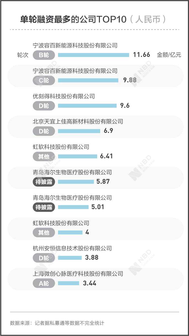 與此同時(shí),上榜融資輪次TOP12的公司中,融資記錄最少的有4家,分別有7次融資記錄。單輪融資最多TOP10