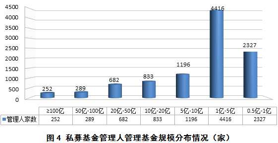 截至2019年5月底,已登記私募基金管理人管理基金規(guī)模在100億元及以上的有252家,管理基金規(guī)模在50億?—100億元的289家,管理基金規(guī)模在20億—50億元的682家,管理基金規(guī)模在10億—20億元的833家,管理基金規(guī)模在5億—10億元的1196家,管理基金規(guī)模在1億—5億元的4416家,管理基金規(guī)模在0.5億—1億元的2327家。截至2019年5月底,已登記的私募基金管理人有管理規(guī)模的共21316家,平均管理基金規(guī)模6.24億元。