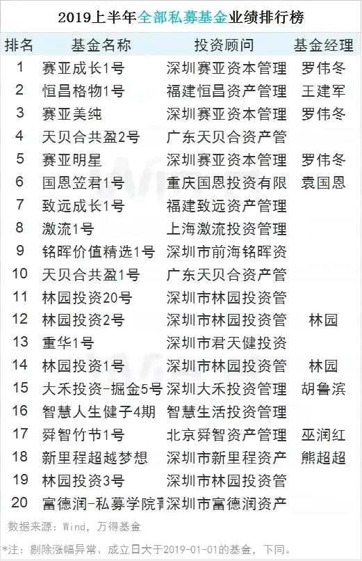 在Wind數(shù)據(jù)覆蓋的全部披露半年末凈值的9652只私募基金中,賽亞成長(zhǎng)1號(hào)業(yè)績(jī)獲得上半年度冠軍,恒昌格物1號(hào)、賽亞美純分別位居第二、第三,前17名均給投資者帶來了超過一倍的驚人收益。