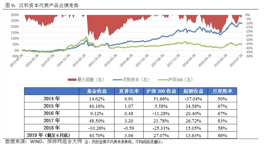 漢和資本旗下產(chǎn)品均采用復(fù)制策略,產(chǎn)品凈值走勢相對一致,我們選取了其中具有代表性的某只產(chǎn)品。該產(chǎn)品2013年9月成立以來,年化收益22.29%,累計(jì)凈值3.36。過去三年均大幅跑贏滬深300,除2018年凈值下跌10.26%外,其余年份均取得正收益,產(chǎn)品月度勝率較高,長期業(yè)績排名位于市場前5%。