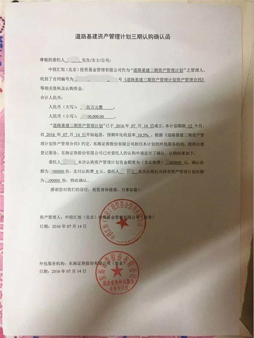 2016年7月,投資者金女士(化名)購買了中投匯恒基金旗下的道路基建三期資產(chǎn)管理計劃300多萬元,資管計劃期限為1年,到期返還收益10.5%。但在該資管計劃到期之后,金女士不但沒有收到應有利息,就連本金也全部被套。