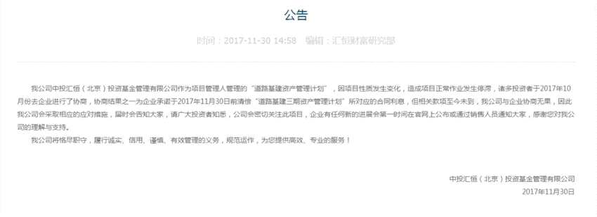 然而,2017年11月30日,中投匯恒基金方面表示,旗下管理的“道路基建資產(chǎn)管理計劃”因項目性質(zhì)發(fā)生變化,造成項目正常作業(yè)發(fā)生停滯,諸多投資者于2017年10月份去項目方進行了協(xié)商,協(xié)商結(jié)果之一為項目方承諾于2017年11月30日前清償“道路基建三期資產(chǎn)管理計劃”所對應的合同利息,但相關(guān)款項至今未到,公司與項目方協(xié)商無果。