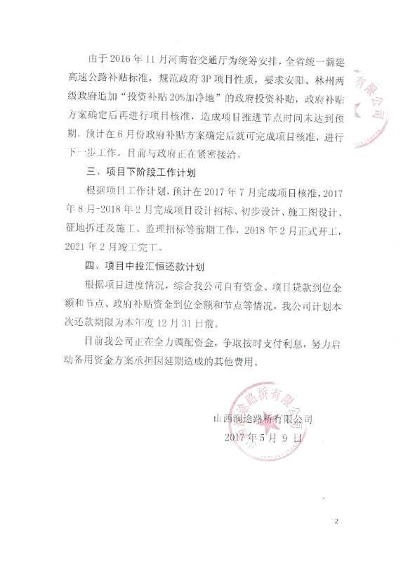 2017年5月,項目方公司股東山西潤途路橋表示,“計劃本次還款期限為本年度12月31日前。目前公司正在全力調(diào)配資金,爭取按時支付利息”。