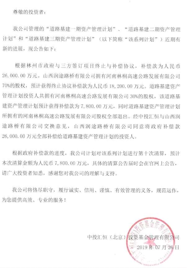 今年7月26日,中投匯恒基金發(fā)布了該資管計劃的第十次清算公告,山西潤途路橋劃入清算款7800萬元。根據(jù)公告,公司前九次清算已分配總金額3889.6萬元,所有投資者參與本金總和為2.992億元,不同投資者因持有份額不同,按照不同比例進行清算分配。同時,公告還顯示,山西潤途路橋?qū)⒄a償款2.6億元全部補償給投資者。