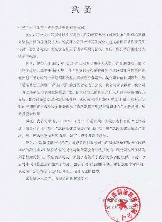 2017年10月,山西潤途路橋發(fā)出一份承諾書,將于2018年1月31日前回購中投匯恒基金旗下三期道路基建資管計劃的所有份額本金及利息,并提出了還款來源的四種途徑。還約定2017年11月30日前清償合同利息。