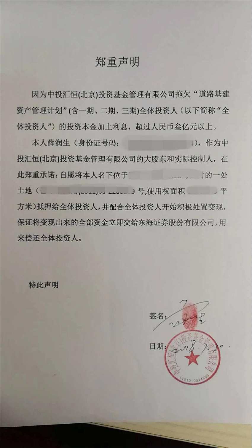 薛潤生提供給投資者的手寫承諾書中提及,于2019年6月1日兌付投資者的投資款。鄭重聲明中提及,愿將名下一處土地抵押變現(xiàn)用于償還全體投資者。在薛潤生的另一份承諾書中,其表明要償還三期資管計劃的本金及利息,但目前來看,薛潤生只償還了一部分本金。