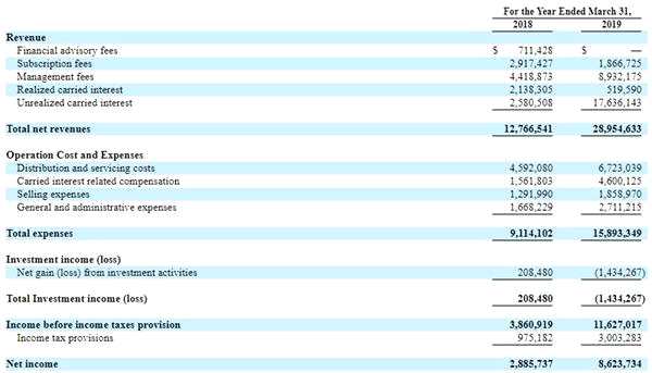 值得一提的是,在最新招股書當(dāng)中,即2018年4月1日至2019年3月31日的數(shù)據(jù)當(dāng)中,基巖資本總營(yíng)收2895.46萬美元,同比增長(zhǎng)126.80%,凈利潤(rùn)收入862.37萬美元,同比大幅增長(zhǎng)198.84%??梢灶A(yù)計(jì)的是,隨著上市帶來的品牌效應(yīng),加上當(dāng)前基金到期結(jié)算后,基巖資本今年下半年的凈利潤(rùn)大概率會(huì)有進(jìn)一步的飛躍。
