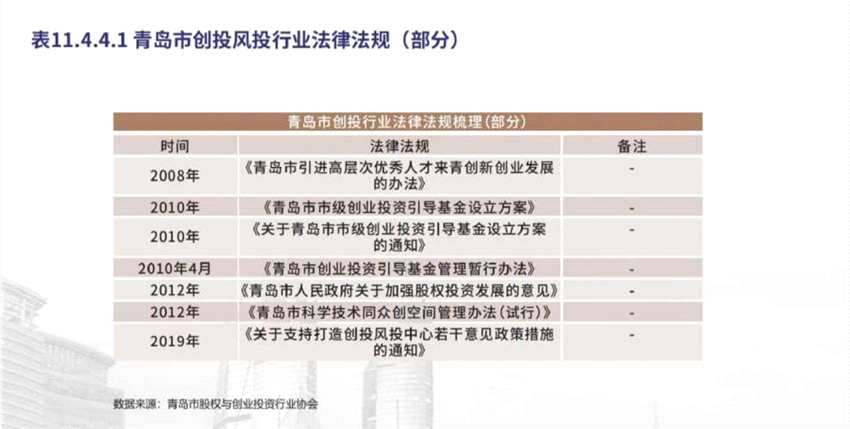 2019年5月,青島市政府發(fā)布《關(guān)于支持打造創(chuàng)投風(fēng)投中心若干意見政策措施的通知》,這項被稱為“青島創(chuàng)投風(fēng)投十條”的鼓勵政策在國內(nèi)創(chuàng)投風(fēng)投行業(yè)中引起了廣泛關(guān)注。而近年來,青島市已發(fā)布多項創(chuàng)業(yè)、創(chuàng)投支持和鼓勵政策,“創(chuàng)業(yè)、創(chuàng)新+創(chuàng)投”的協(xié)同互動發(fā)展格局正在逐漸形成。