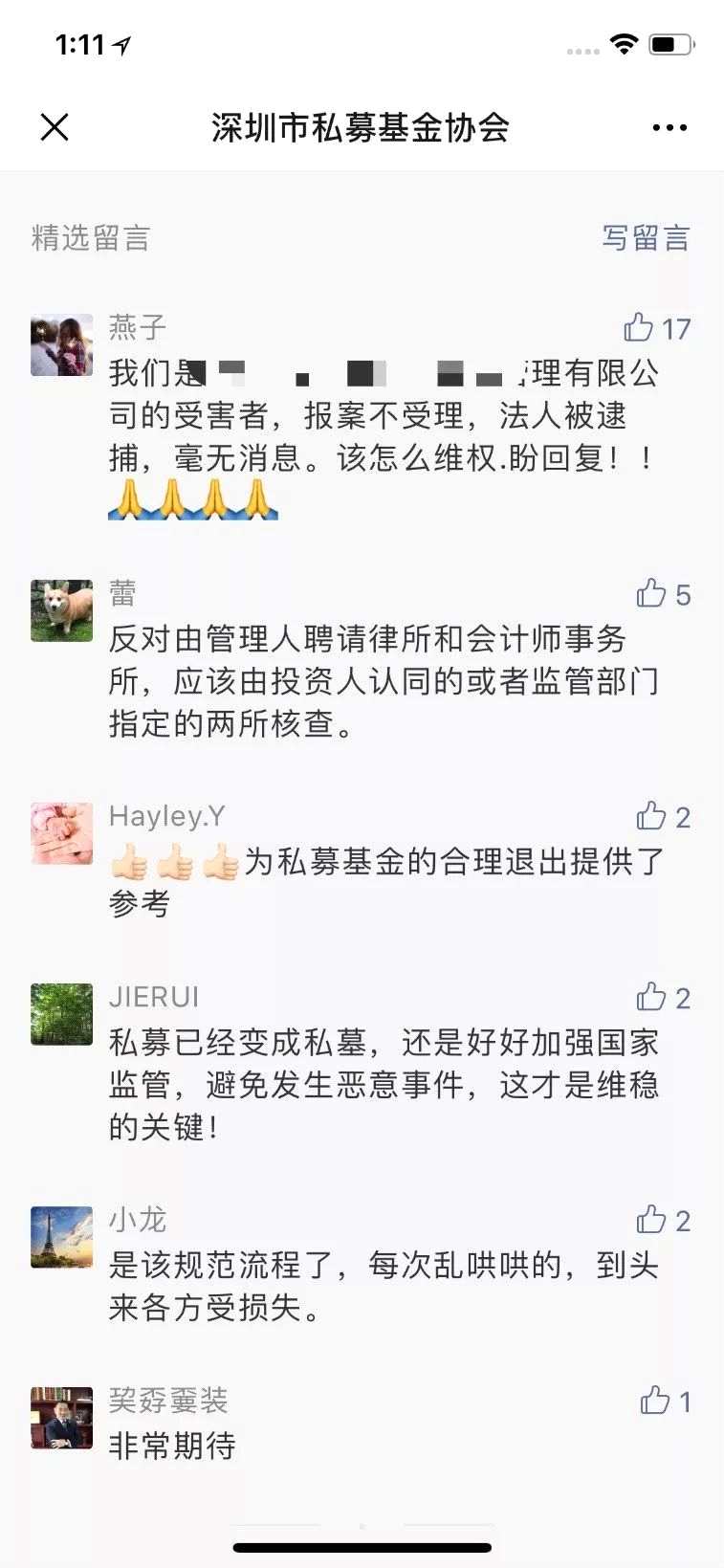 在《退出參考》發(fā)布以后,對于這份全國首份“問題私募”基金退出指引的提出,引起了業(yè)內(nèi)的紛紛“點贊”。投資者也激動不已,紛紛在協(xié)會的公眾號下留言: