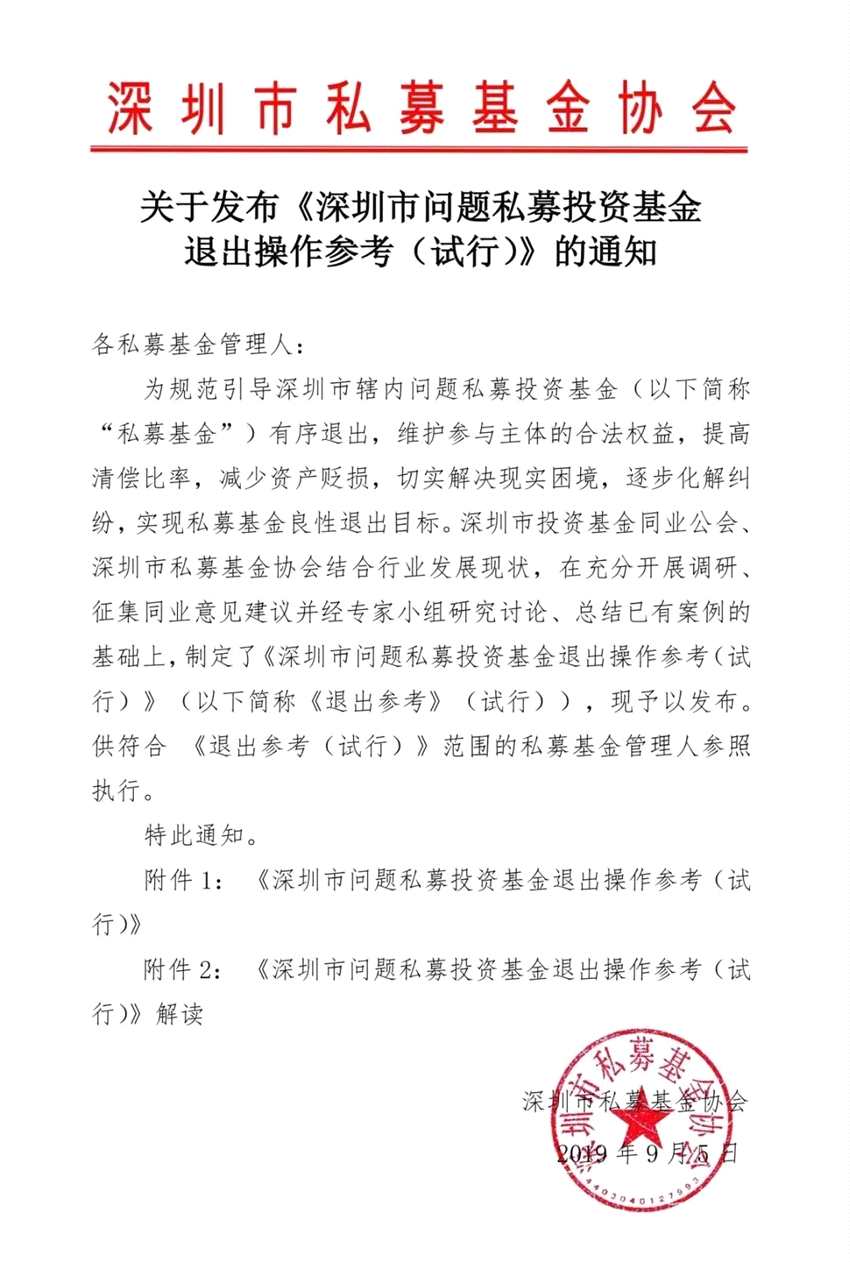 每年秋季,深圳私募基金業(yè)協(xié)會(以下簡稱“協(xié)會”)都要放出“重磅消息”,震驚全行業(yè)! 去年十月,協(xié)會發(fā)布了深圳福田區(qū)支持私募基金行業(yè)發(fā)展若干措施,對私募機構(gòu)最高支持3000萬。令不少私募都怦然心動想在深圳福田落戶! 一年后的今天,協(xié)會筆鋒一轉(zhuǎn):發(fā)布了《深圳市問題私募投資基金退出操作參考(試行)》,瞬間讓業(yè)內(nèi)炸了!這意味著,深圳率先發(fā)布了國內(nèi)首份問題私募基金退出指導(dǎo)。