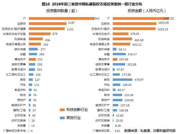 這主要受益于2019年7月份科創(chuàng)板開板。科創(chuàng)板開板以來,首批25家企業(yè)集中發(fā)行,隨著審核注冊(cè)工作步入常態(tài)化,平均每周發(fā)行2家至3家,融資規(guī)模每家平均在10億元左右。私募通數(shù)據(jù)顯示,2019年前11個(gè)月私募股權(quán)投資通過科創(chuàng)板IPO退出的達(dá)到591筆,占全部IPO退出的比例超四成。分季度來看,2019年第三季度被投企業(yè)IPO數(shù)量達(dá)528筆,其中有372筆來自于被投企業(yè)科創(chuàng)板IPO,占比高達(dá)70.5%。 從行業(yè)上來看,受科創(chuàng)板政策導(dǎo)向、中國(guó)芯片自主化影響,2019年IPO退出行業(yè)主要集中分布在半導(dǎo)體及電子設(shè)備、生物制藥、機(jī)械制造行業(yè)。截止11月底科創(chuàng)板上市的56家企業(yè)中,半導(dǎo)體及電子設(shè)備行業(yè)有15家,生物技術(shù)/醫(yī)療健康行業(yè)有11家,兩者占比最大。這對(duì)私募機(jī)構(gòu)投資策略形成反饋,使得半導(dǎo)體及電子設(shè)備行業(yè)在投資案例數(shù)量上躍居第四。 (2)境內(nèi)上市環(huán)境改善,對(duì)科技創(chuàng)新企業(yè)IPO吸引力日益提升。