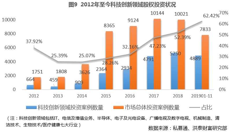當(dāng)前我國(guó)經(jīng)濟(jì)進(jìn)入降速換擋、轉(zhuǎn)向高質(zhì)量發(fā)展階段,順應(yīng)國(guó)家產(chǎn)業(yè)升級(jí)需求,以及推動(dòng)高科技產(chǎn)業(yè)投資、鼓勵(lì)創(chuàng)新發(fā)展的政策導(dǎo)向,股權(quán)投資在支持科技創(chuàng)新上的作用日益提升。投資機(jī)構(gòu)對(duì)人工智能、高端裝備制造等硬科技領(lǐng)銜的科技創(chuàng)新領(lǐng)域布局持續(xù)加速??萍紕?chuàng)新領(lǐng)域投資占比呈現(xiàn)逐年遞增趨勢(shì),在2019年整體投資案例數(shù)量、投資金額雙降情況下,前11個(gè)月投資案例數(shù)達(dá)4889件,占比提升至62%。