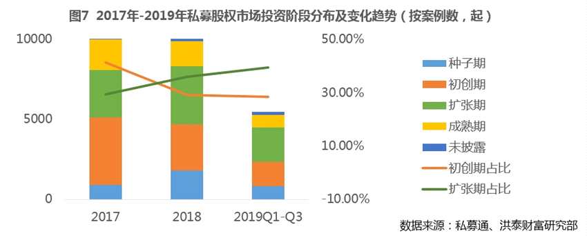 投資機(jī)構(gòu)出手謹(jǐn)慎,不僅體現(xiàn)為在投資案例數(shù)量上的大幅降低,在輪次偏好上更傾向于盈利模式清晰且收益見效快的擴(kuò)張期、成熟期企業(yè)。數(shù)據(jù)顯示,2019年前三季度投資案例總數(shù)5461起,同比2018年同期的6680起下滑近兩成。其中,種子期及初創(chuàng)期的投資案例數(shù)與投資金額降幅較大,占比相比去年同期分別下降4.5%和3.0%;而擴(kuò)張期的占比自2017后,已連續(xù)兩年上升。