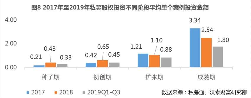 在對(duì)單個(gè)案例的投資額上,2019年投資機(jī)構(gòu)對(duì)不同階段項(xiàng)目的平均投資額,相比2018年出現(xiàn)整體下調(diào)。尤其對(duì)于種子期、初創(chuàng)期項(xiàng)目,一改2018年平均投資額上升的特點(diǎn),降低到接近2017年的水平。這一方面是由于投資機(jī)構(gòu)在投資策略上的謹(jǐn)慎所致;另一方面是由于股權(quán)市場(chǎng)整體估值水平在下調(diào),2017年底開始的全球主要二級(jí)市場(chǎng)大跌殺估值,以及近兩年多家獨(dú)角獸公司上市破發(fā)現(xiàn)象,造成對(duì)一級(jí)市場(chǎng)不同階段項(xiàng)目的估值壓縮,并逐層向前傳導(dǎo)已至早期階段,市場(chǎng)估值逐步回歸理性。