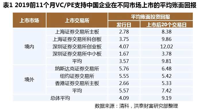 2019年中美兩國(guó)關(guān)系的不確定性提升,兩國(guó)博弈已經(jīng)從貿(mào)易領(lǐng)域,延伸至科技、金融領(lǐng)域。2019年9月27日,白宮聲稱美方正在考慮限制對(duì)華投資的措施。相關(guān)措施是否會(huì)推出將取決于中美兩國(guó)關(guān)系的進(jìn)展,不排除未來會(huì)在中國(guó)企業(yè)申請(qǐng)赴美上市的條件上設(shè)置更多障礙。隨著國(guó)內(nèi)資本市場(chǎng)對(duì)外開放加速,科創(chuàng)板注冊(cè)制常態(tài)化、新三板深化改革、創(chuàng)業(yè)板發(fā)行注冊(cè)制改革等多層次資本市場(chǎng)建設(shè)和改革舉措,為中小型企業(yè)的上市及股權(quán)投資機(jī)構(gòu)的退出提供更多元化路徑。一批科技創(chuàng)新企業(yè)面臨著融資方向上的戰(zhàn)略性調(diào)整,從海外美國(guó)市場(chǎng)向大陸A股市場(chǎng)、香港市場(chǎng)轉(zhuǎn)移或?qū)⒊蔀橼厔?shì)。 (3)“硬科技”企業(yè)享估值溢價(jià),境內(nèi)IPO退出回報(bào)水平提升。