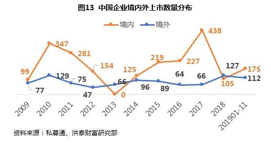 從企業(yè)境內(nèi)外上市數(shù)量分布來看,境內(nèi)上市環(huán)境改善,對(duì)企業(yè)IPO吸引力日益提升,2019年中國(guó)企業(yè)境內(nèi)上市數(shù)量反超境外。2019年前11月,中國(guó)企業(yè)通過境內(nèi)上市的達(dá)175家,通過境外上市保持相對(duì)穩(wěn)定為112家;尤其在科創(chuàng)板開板后,第三季度中企境內(nèi)上市數(shù)量達(dá)到63家,境外上市數(shù)量縮至15家,境內(nèi)上市占比達(dá)八成。