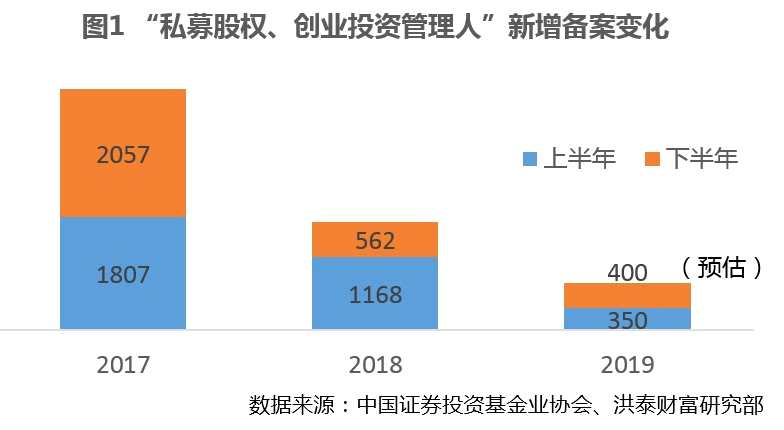 2018年初至2019年底,全球經(jīng)濟(jì)增速整體放緩,主要二級(jí)市場(chǎng)波動(dòng)加劇,同時(shí)貿(mào)易摩擦、地緣政治等問題造成的不確定性因素提升,避險(xiǎn)情緒同樣蔓延至股權(quán)投資市場(chǎng)。根據(jù)Preqin統(tǒng)計(jì)數(shù)據(jù)顯示,截至2018年底,全球PE/VC機(jī)構(gòu)總資產(chǎn)規(guī)模(AUM)達(dá)到近6000億美元,創(chuàng)歷史新高,但同比增長(zhǎng)率創(chuàng)2014年來新低,加上屢創(chuàng)新高的總募資額和交易投資總案例也于2016至頂后雙雙下滑,顯示行業(yè)增速在全球范圍內(nèi)均有所放緩。 除了經(jīng)濟(jì)周期對(duì)全行業(yè)的影響,國(guó)內(nèi)監(jiān)管政策變化也使得2018年成為中國(guó)股權(quán)投資市場(chǎng)的拐點(diǎn),整體市場(chǎng)進(jìn)入募資難、市場(chǎng)分化向頭部機(jī)構(gòu)集中的新周期。2018年底至2019年,“僧多粥少”的狀況從募資市場(chǎng)傳導(dǎo)至企業(yè)融資端,機(jī)構(gòu)投資策略更為謹(jǐn)慎。 2019年,國(guó)內(nèi)私募股權(quán)、創(chuàng)業(yè)投資新增管理人延續(xù)2018年的回落趨勢(shì)。根據(jù)中國(guó)證券投資基金業(yè)協(xié)會(huì)的數(shù)據(jù)顯示,2018年協(xié)會(huì)新增登記私募基金管理人1730家,同比2017年的3864家下滑55%,截至2019年11月底,協(xié)會(huì)年內(nèi)新增登記私募基金管理人695家,預(yù)計(jì)全年同比下滑速度與去年接近。2019年內(nèi)協(xié)會(huì)備案“私募股權(quán)、創(chuàng)業(yè)投資管理人”的總體數(shù)量、管理規(guī)模逐月穩(wěn)步小幅增長(zhǎng)。