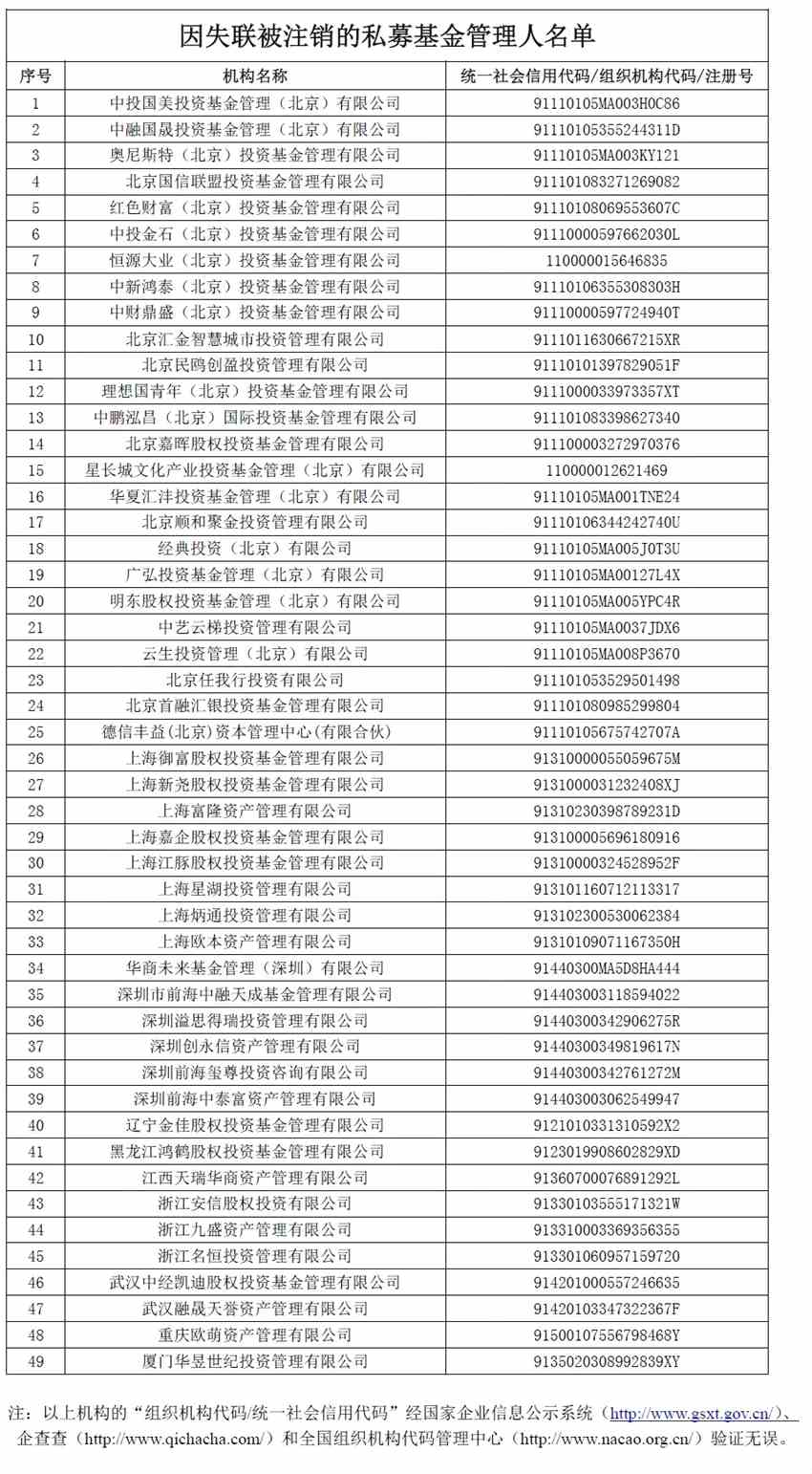 現(xiàn)有中投國美投資基金管理(北京)有限公司等49家機(jī)構(gòu)達(dá)到公示期滿三個(gè)月且未主動(dòng)聯(lián)系協(xié)會(huì)并提供有效證明材料的注銷條件。協(xié)會(huì)將注銷該49家機(jī)構(gòu)私募基金管理人登記,并將上述情形錄入資本市場誠信檔案數(shù)據(jù)庫。社會(huì)公眾可通過證券期貨市場失信記錄查詢平臺(tái)(http://neris.csrc.gov.cn/shixinchaxun/)進(jìn)行查詢。已注銷機(jī)構(gòu)不再具有私募基金管理人資格,不得再以私募基金名義展業(yè)。