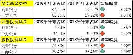 具體數(shù)據(jù)來看,四大龍頭所托管的全部私募基金數(shù)量占比之和為66.05%,較2018年的67.87%,下降了1.82%。
