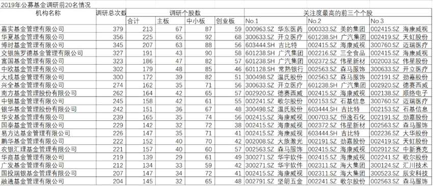 2019年公募基金調(diào)研前20名情況: