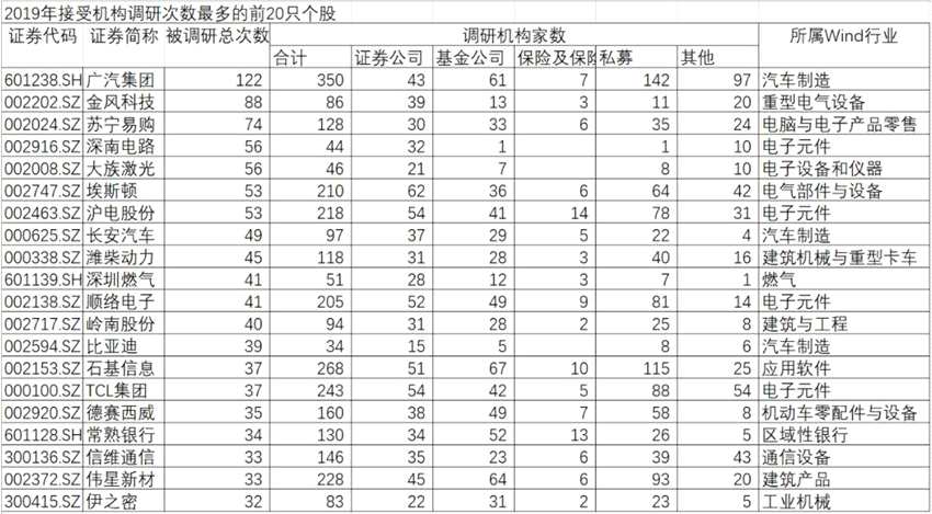 從調(diào)研的次數(shù)來看,廣汽集團被調(diào)研的次數(shù)最多,一共被機構(gòu)調(diào)研了122次,共有350家次機構(gòu)參與了調(diào)研,其中包含基金公司61家次,私募基金142家次。這也是唯一一個讓機構(gòu)在一年中調(diào)研超100次的個股。除了廣汽集團,還有6家公司被機構(gòu)調(diào)研超過50次,其中金風科技(002202)被調(diào)研88次,蘇寧易購(002024)被調(diào)研74次,深南電路(002916)和大族激光(002008)被調(diào)研56次,埃斯頓(002747)和滬電股份(002463)被調(diào)研53次。