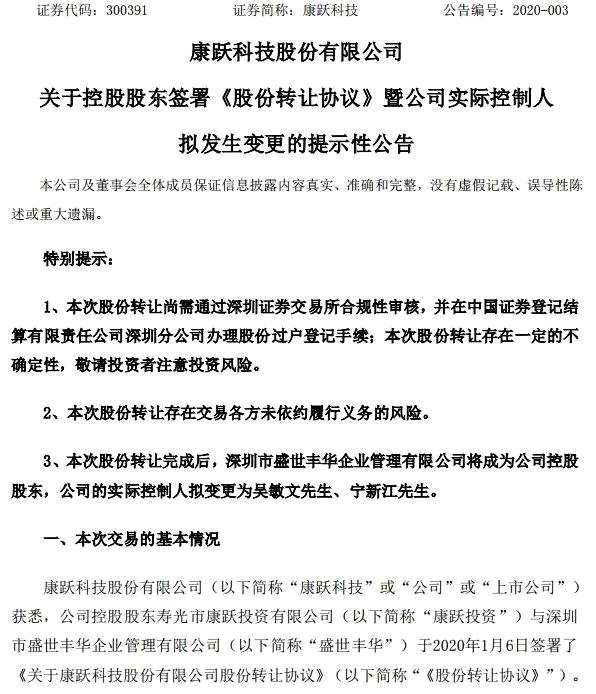 摘要: PE機(jī)構(gòu)“買殼”又有新動向??弟S科技(300391)1月6日晚間公告,公司控股股東壽光市康躍投資有限公司(康躍投資)與深圳市盛世豐華企業(yè)管理有限公司(盛世豐華)于1月6日簽署股份轉(zhuǎn)讓協(xié)議,康躍投資將向
