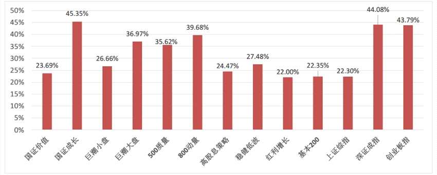 市場(chǎng)風(fēng)格方面,國(guó)證成長(zhǎng)指數(shù)漲幅為45.35%,國(guó)證價(jià)值指數(shù)漲幅為23.69%,市場(chǎng)整體偏成長(zhǎng)風(fēng)格,此外,大盤(pán)股指數(shù)的漲幅也要明顯高于小盤(pán)股指數(shù)。策略指數(shù)方面,基本面因子如質(zhì)量、紅利、穩(wěn)健等均取得了超過(guò)20%的漲幅;技術(shù)面因子800動(dòng)量指數(shù)漲幅亮眼,全年漲幅接近40%。