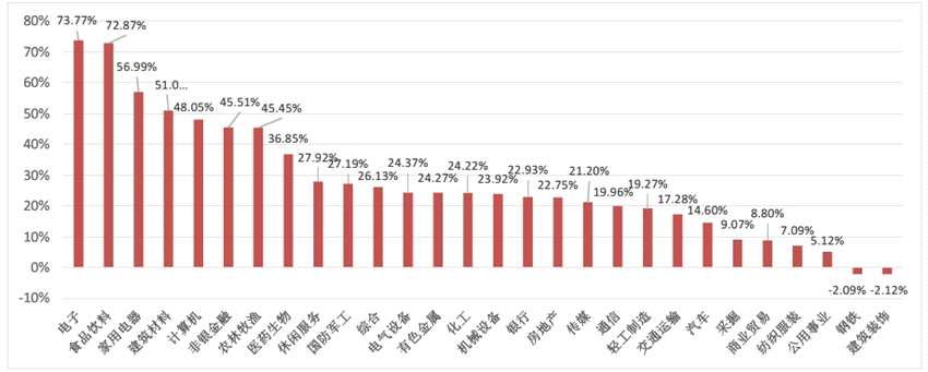 行業(yè)方面,28個(gè)申萬(wàn)一級(jí)行業(yè)里,科技、大消費(fèi)等板塊表現(xiàn)突出,電子、食品飲料和家用電器漲幅靠前,分別為78.77%、72.87%和56.99%。除鋼鐵和建筑服飾外,其余行業(yè)全年均取得正收益。周期行業(yè)如建筑材料、國(guó)防軍工、有色金屬和化工等漲幅也均在20%以上。