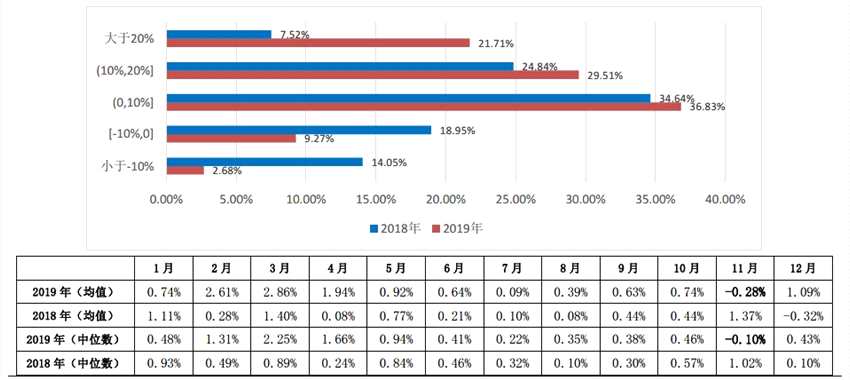 我們統(tǒng)計(jì)了成立滿2年,凈值披露完整的相對(duì)價(jià)值策略私募基金產(chǎn)品2019年業(yè)績(jī)分布情況。從區(qū)間業(yè)績(jī)分布來(lái)看,主要集中在[0,10%]和[10%,20%]區(qū)間,占比分別為36.83%和29.51%,均高于2018年同期占比,全年收益在20%以上的產(chǎn)品占比21.71%,較2018年7.52%提升明顯;相反,收益小于零的產(chǎn)品合計(jì)占比約10%,遠(yuǎn)低于2018年的33%。整體來(lái)看,2019年相對(duì)價(jià)值策略私募基金業(yè)績(jī)提升明顯。