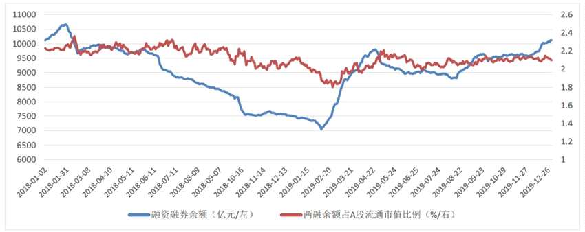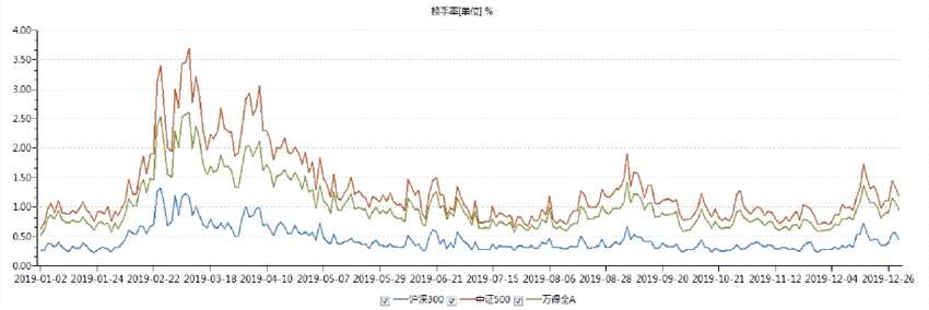 兩融余額能在一定程度上反應(yīng)市場(chǎng)情緒和投資者的投機(jī)程度。兩融余額在2018年下觸底以后,2019年1季度開(kāi)始回暖,市場(chǎng)情緒在4月底達(dá)到頂峰,5-7月受中美貿(mào)易戰(zhàn)加劇預(yù)期影響,市場(chǎng)情緒有較大幅度回調(diào),四季度市場(chǎng)情緒整體在低位震蕩,無(wú)明顯回升。下半年市場(chǎng)情緒走低對(duì)中性策略也帶來(lái)一定的負(fù)面影響,不利于Alpha的獲取。