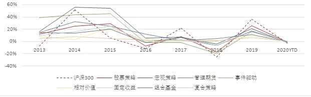 若拉長(zhǎng)歷史觀測(cè)時(shí)間,2013年以來(lái)各策略表現(xiàn)如下兩圖。可見隨著時(shí)間增長(zhǎng),各市場(chǎng)有趨于理性的趨勢(shì),賺快錢的機(jī)會(huì)變少,2016年之后各策略收益率有所下降,同時(shí)各策略間收益差距變小。此外單看2020年1月,各策略收益排名和上月相比基本相反,和股票相關(guān)性高的策略收益排名靠后,而以收益較穩(wěn)健的固定收益和相對(duì)價(jià)值排名靠前。