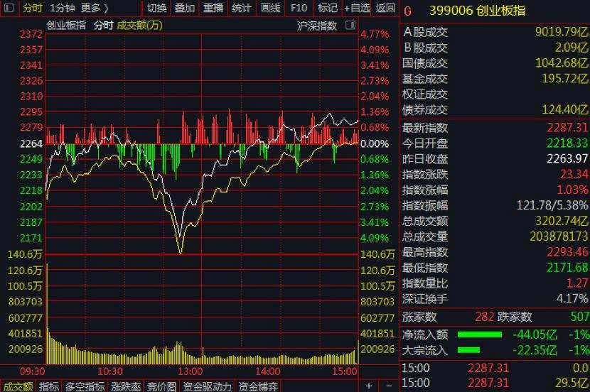 兩市五大股指(上證綜指、深證成指、中小板指、創(chuàng)業(yè)板指和滬深300)中,三大股指在兩市單日合計(jì)成交金額突破1.4萬(wàn)億元的天量交投中頑強(qiáng)收漲。創(chuàng)業(yè)板指更是在盤(pán)中一度大跌逾4%的情況下,收漲1.03%。