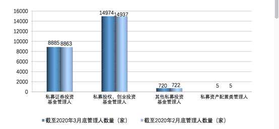 從管理人數(shù)量來看,截至2020年3月底,存續(xù)登記私募證券投資基金管理人8885家,較上月增加22家;私募股權(quán)、創(chuàng)業(yè)投資基金管理人14974家,較上月增加37家;其他私募投資基金管理人720家,較上月減少2家;私募資產(chǎn)配置類管理人5家。