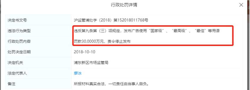 在2018年10月,朝陽永續(xù)曾因發(fā)布廣告使用“國家級”“最高級”“最佳”等用于,被浦東工商局罰款30萬元。