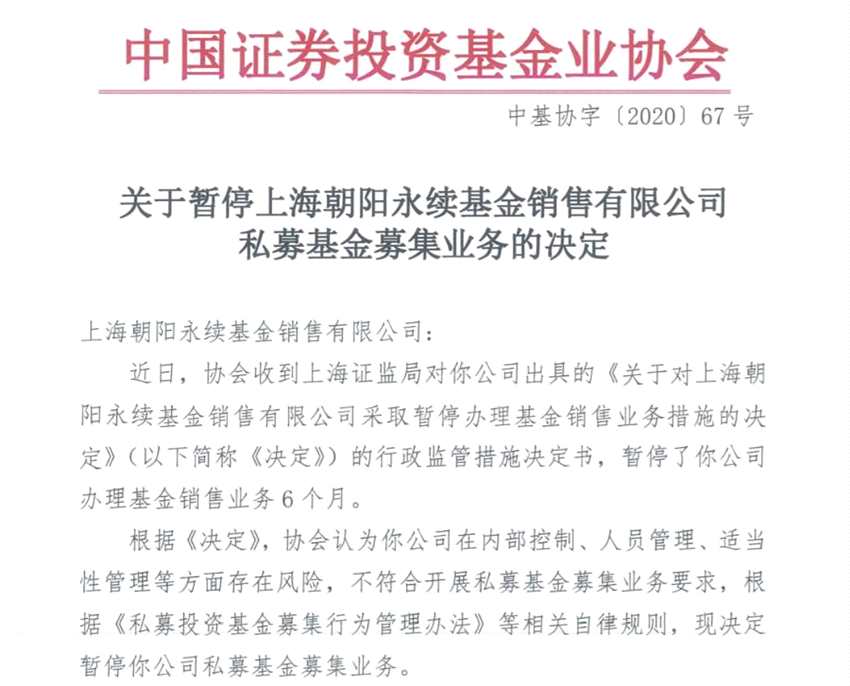 基金業(yè)協(xié)會公告稱,近日收到上海證監(jiān)局對朝陽永續(xù)出具的《關于對上海朝陽永續(xù)基金銷售有限公司采取暫停辦理基金銷售業(yè)務措施的決定》的行政監(jiān)管措施決定書,暫停了公司辦理基金銷售業(yè)務6個月。